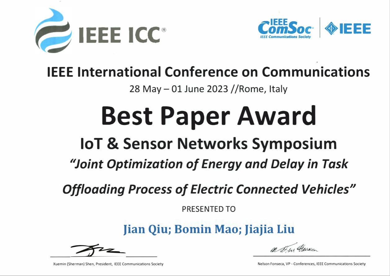 刘家佳教授团队的研究成果“Joint Optimization of Energy and Delay in Task Offloading Process of Electric Connected Vehicles”在众多论文中脱颖而出,获得了本次大会最佳论文奖。该论文我校为唯一署名单位,论文作者分别为色播