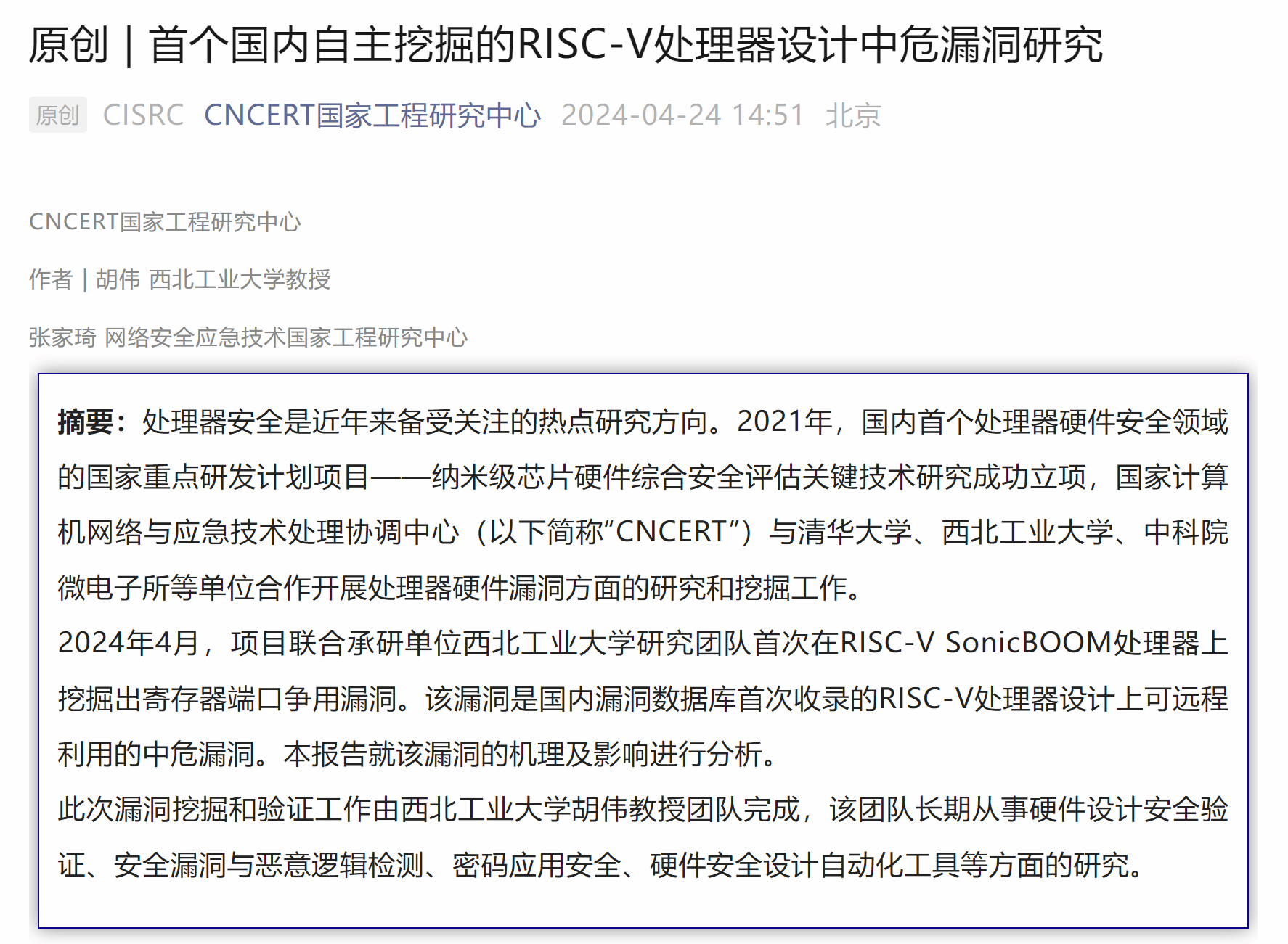 近日,国家计算机网络与应急技术处理协调中心(CNCERT)传来喜讯,专题报道我校色播 胡伟教授团队在RISC-V SonicBOOM处理器设计中挖掘出中危漏洞。这是国内首个自主挖掘的RISC-V处理器设计上可远程利用的中危漏洞,也是国内首个处理器硬件安全领域国家重点研发计划项目——纳米级芯片硬件综合安全评估关键技术研究的重要进展。