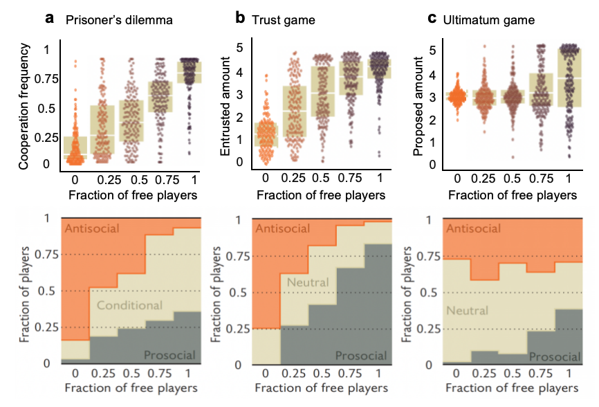 当今世界,广泛存在的博弈交互行为(合作、竞争、对抗等)已经成为各类系统稳定运行的基础。应运而生的博弈智能则通过对博弈关系的精准建模、求解、优化,进而形成决策知识库,成为助力国家人工智能战略和航空航天重大工程的重要基础理论。然而,现有研究难以充分解释大规模智能体、多元交互等复杂场景中合作涌现的内在机理和演化规律。针对这一挑战,色播 王震教授团队研究了多元决策模式的大规模行为博弈,首次揭示了社交网络能动性(即增加网络中博弈智能体的决策自由度)可以显著激发群体合作、信任与公平等亲社会行为,为完善群体智能涌现理论提供了更充分的科学依据。最新研究成果以 Social networking agency and prosociality are inextricably linked in economic games 为题发表在Nature Human Behaviour 。