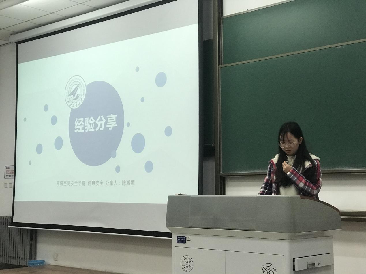 2017级的高丽同学结合自身经历,从基地、竞赛、科研三个方面为大家讲述了自己的经验,她讲到学校设立了足球机器人、舞蹈机器人、ACM、智能车、节能减排等基地,开展了数学建模、CTF等竞赛活动,大家可根据自己的特长和喜好选择加入,如果不知道自己想做什么,可以多加尝试,在不断尝试和学习中找到兴趣点并不懈为之奋斗。在分享的最后,高丽同学提到“学分积虽然重要但不是全部,我们应该学懂学透彻专业知识,做到灵活运用”。