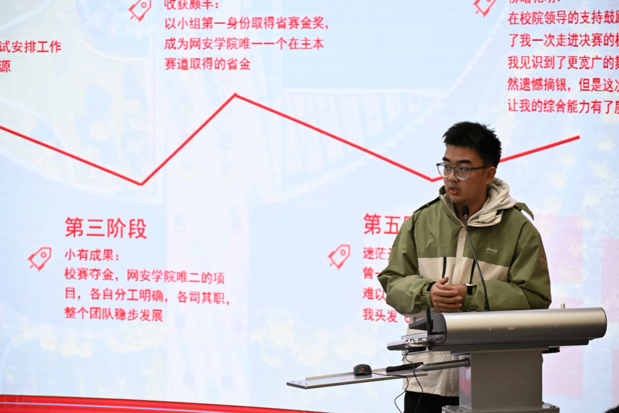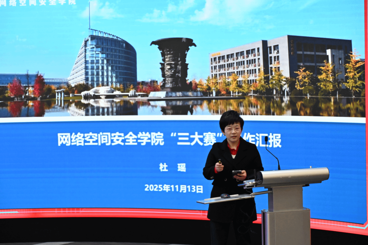 杜瑶从我们的起步、我们的探索、我们的成果、总结与反思、未来规划几个方面详细汇报了学院近两年在创新创业教育及构建学院竞赛文化方面的探索与实践,特别是以优秀院友鲜活的案例生动展现了“以赛育人”模式的显著成效与深远影响。她强调,双创工作不仅是培养学生创新精神与实践能力的重要途径,更是推动“一流网络安全学院建设示范项目”迈向新高度的驱动器,两者相辅相成,共同提升网安实战型高素质专业人才的培养质量。