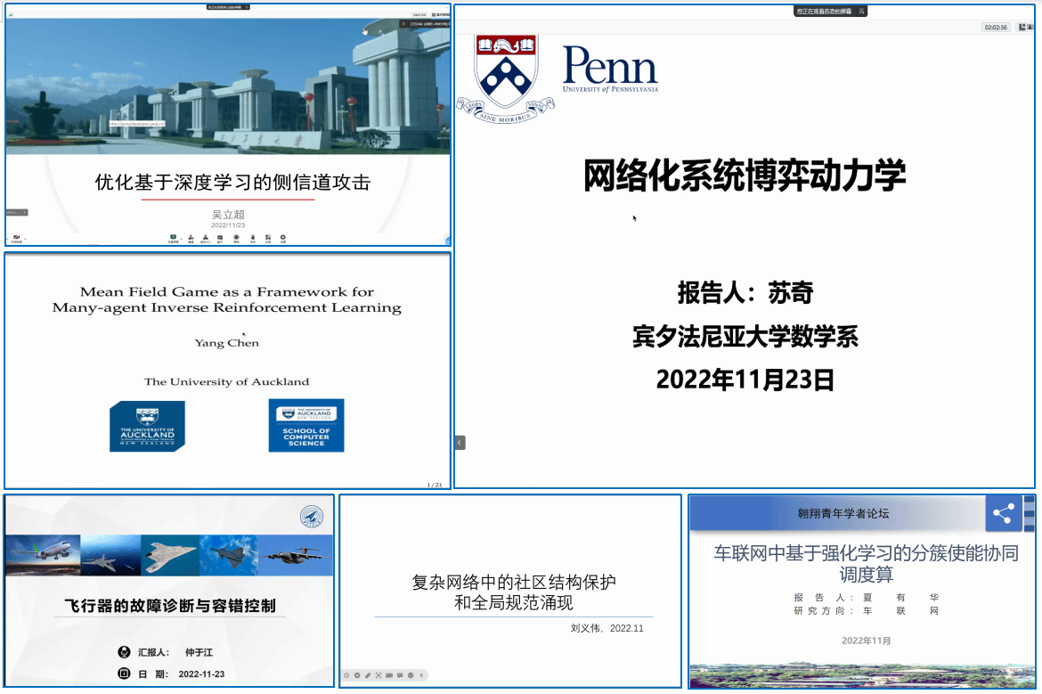 本次论坛邀请了6名海内外青年学者代表进行了学术报告。宾夕法尼亚大学研究员苏奇以《网络化系统博弈动力学》,清华大学博士后研究员仲于江以《飞行器的故障诊断与容错控制》为题,奥克兰大学研究员陈阳以《Mean Field Game as a Framework for Many-agent Inverse Reinforcement Learning》为题,代尔夫特理工大学博士研究生吴立超以《优化基于深度学习的侧信道攻击》为题,武汉大学博士研究生夏有华以《车联网中基于强化学习的分簇使能协同调度》为题,国防科工局工程师刘义伟以《复杂网络中的社区结构保护和全局规范涌现》为题分别作了报告。