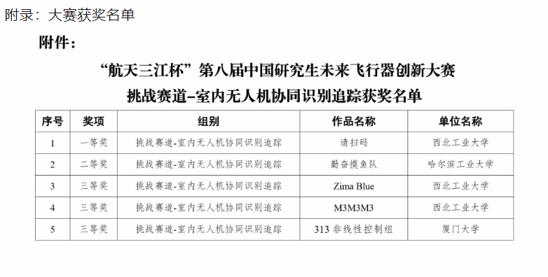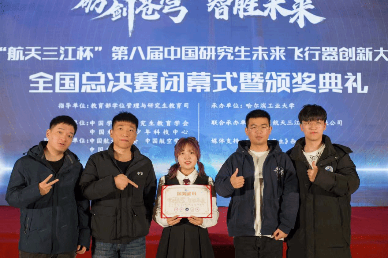 研究生袁坤焱、刘嘉尧、田壮宇、张昊、杨鑫在“航天三江杯”第八届中国研究生未来飞行器创新大赛全国总决赛挑战赛道--室内无人机协同识别追踪赛中荣获一等奖。