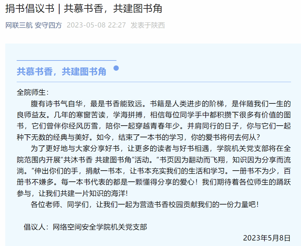 为进一步推进书香校园建设,打造高质量的学院公共文化服务体系,学院机关党支部于5月16至17日在学院图书角举办了“共慕书香,共建图书角”捐书活动,活动开展以来得到了全院师生的广泛参与,机关党支部对积极参与的师生赠送了相关书籍。