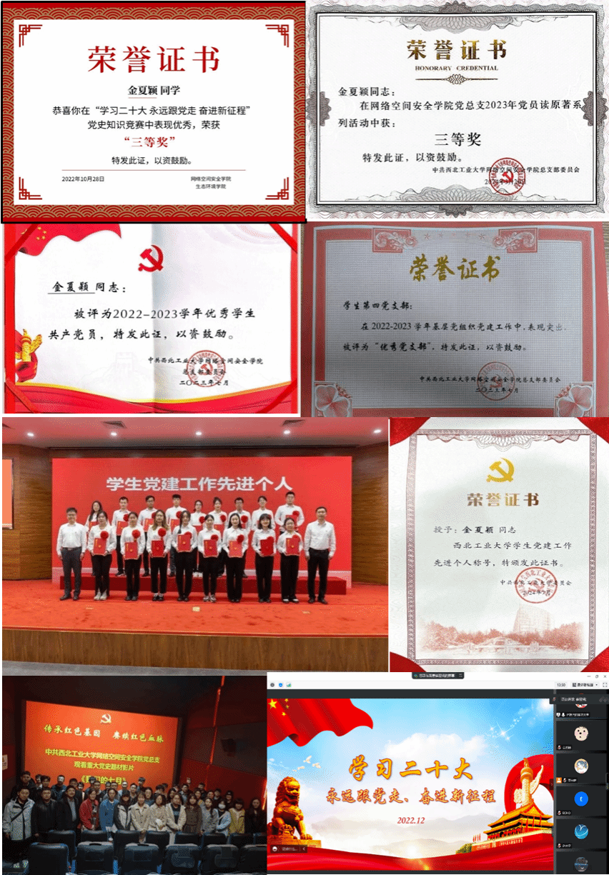 身为党员,她始终坚持在思想建设方面走在前、作表率,以新时代青年党员的使命担当擦亮政治底色。在学院党委的有力引领下,她系统深入学习党的创新理论,将政治理论学习转化为引领行动的精神坐标,并获得“学生党建工作先进个人”、“优秀党员”、“优秀党支部”等荣誉称号。她积极参加迎接建党100周年西北工业大学“百公里跑”接力赛、一二九合唱比赛、党史知识竞赛、汉中古路坝红色毕业教育等活动,深植红色基因。作为党支部的宣传委员兼纪检委员,她始终坚持带领支部党员的理论学习,深入学习贯彻党的二十大精神,并且作为支部的高年级学姐,为支部成员分享经验,发挥党员先锋引领作用。
