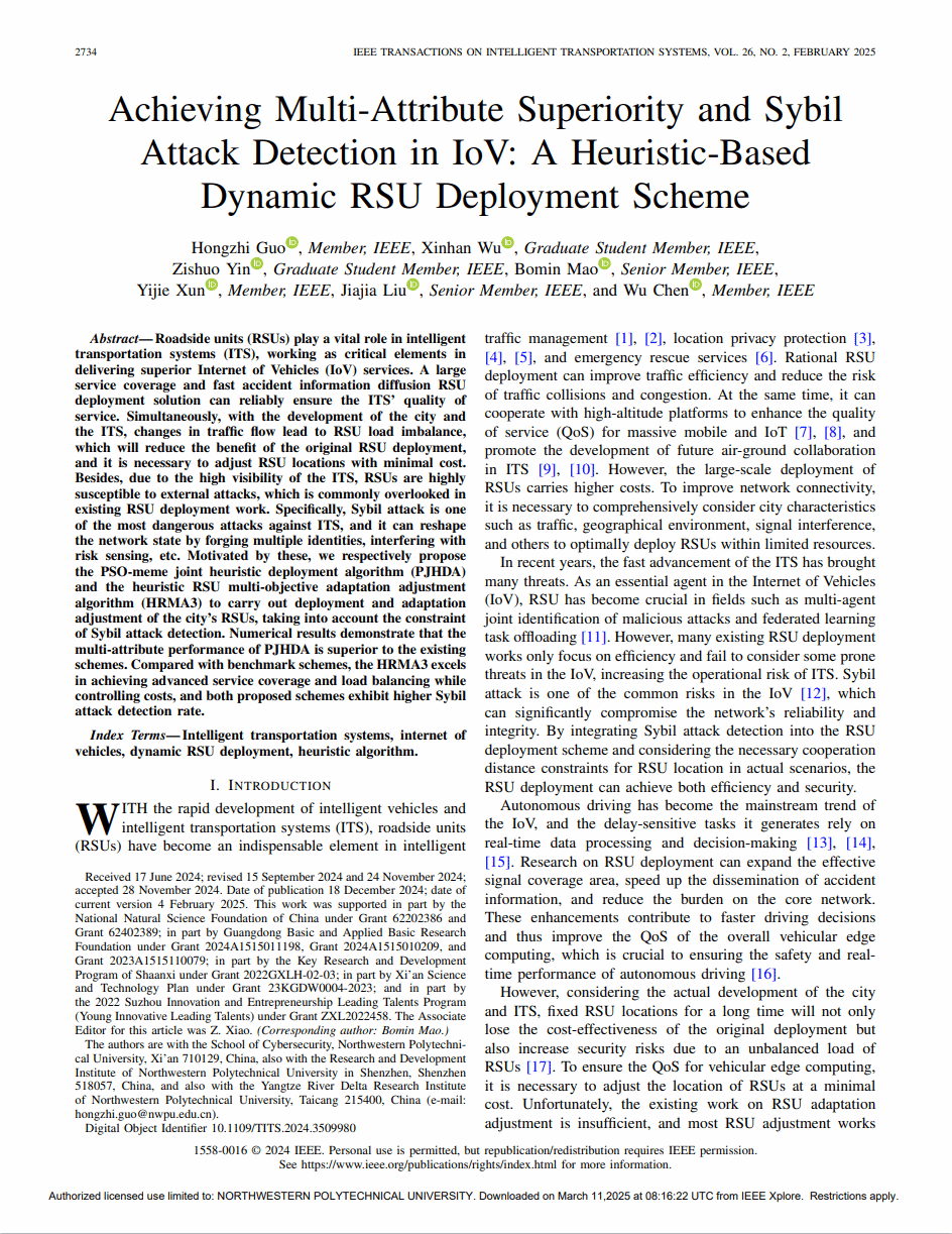 1.《Achieving Multi-Attribute Superiority and Sybil Attack Detection in IoV: A Heuristic-Based Dynamic RSU Deployment Scheme》,学生一作,发表于IEEE Transactions on Intelligent Transportation Systems (SCI, 中科院I区, IF: 7.9)