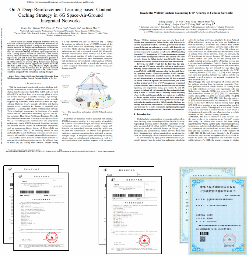 在攻读学士学位期间,魏子翔同学在科研中展现出严谨认真的态度,对知识的积累不仅体现在紧跟计算机前沿技术的发展,更扎根于基础理论与方法的深入理解。在2024年中国计算机学会(CCF)主办的CSP计算机软件能力认证中取得340分,位列全国前1.98%。科研方面,魏子翔同学怀揣对计算机科学的热爱,积极参与课题研究,加入空天地海一体化大数据应用技术国家工程实验室,在毛伯敏教授指导下,围绕边缘缓存、边缘计算、信号处理等方向展开研究,累计参与科研项目六项,其中以第一作者身份发表IEEE Open Journal of the Computer Society (SCI,JCR Q1)论文1篇,以第二作者或学生二作身份发表通信领域顶刊IEEE Journal on Selected Areas in Communications (中科院一区,CCF A)论文1篇、2023 the 15th International Conference on Communication Software and Networks (EI) 会议论文1篇;以第一作者或学生一作身份申请国家发明专利4项,授权软件著作权2项;以其他发明人身份申请三项专利;。此外,魏子翔同学还曾赴清华大学网络科学与网络空间研究院实习,期间产出网安领域顶会论文IEEE Symposium on Security and Privacy论文一篇 (CCF A)。