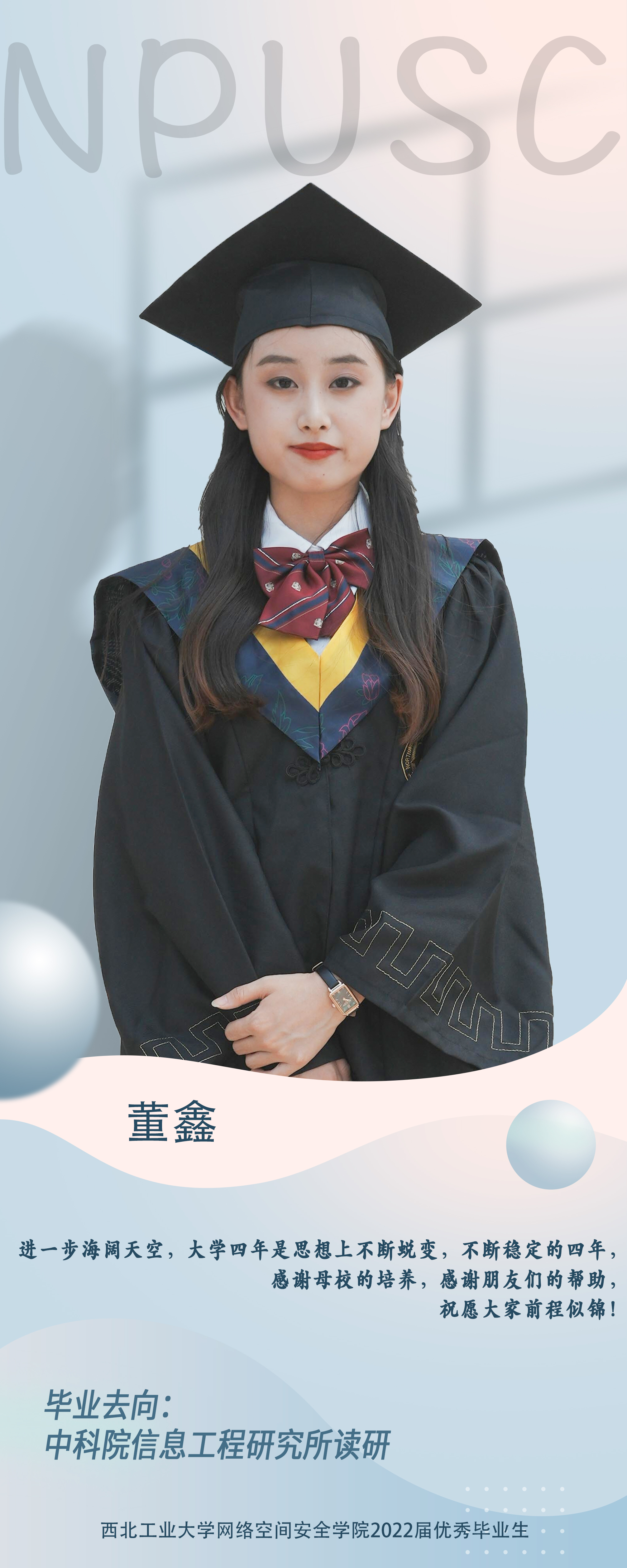 学院2018级本科生董鑫。本科期间学分绩排名7/59,综合排名3/59,。曾获得国家奖学金、校级奖学金,院级奖学金多项,中国机器人大赛国家级一等奖,美国大学生数学建模竞赛国际级一等奖等竞赛奖项,连续三次获得西北工业大学数学建模竞赛一等奖,作为大创主要负责人项目2项,其中国家级创新创业项目一项,并获得国家级优秀结题,省级项目一项重点在研。独立设计软件著作权三项。曾在校学生会视觉艺术部担任干事,负责大型活动海报的制作。曾参与下乡实践活动,调研陕西陇县扶贫工作的开展。疫情期间,积极担任社区的防疫工作。