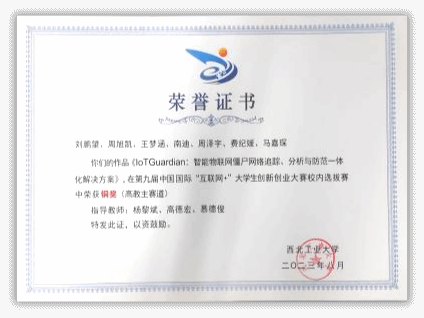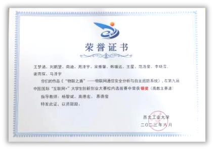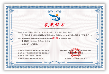 保送至本院攻读硕士研究生,师从杨黎斌副教授,针对网络威胁情报领域开展了深入研究,发表论文2篇,取得发明专利受理5项。主持西北工业大学硕士研究生实践创新能力培育基金1项、西北工业大学2023年“互联网+”大学生创新创业种子项目1项。立足本专业,带队参加“互联网+”大学生创新创业大赛、电子商务“创新、创意及创业”挑战赛、“翱翔杯”研究生电子设计大赛、“三航杯”大学生课外学术科技作品竞赛等,累计获得国家级三等奖1项、省部级一等奖1项、二等奖2项、校级特等奖1项、二等奖2项、三等奖5项。获国家奖学金、小米优秀专项奖学金、校设一等奖学金等,连续两年获评校级优秀研究生。