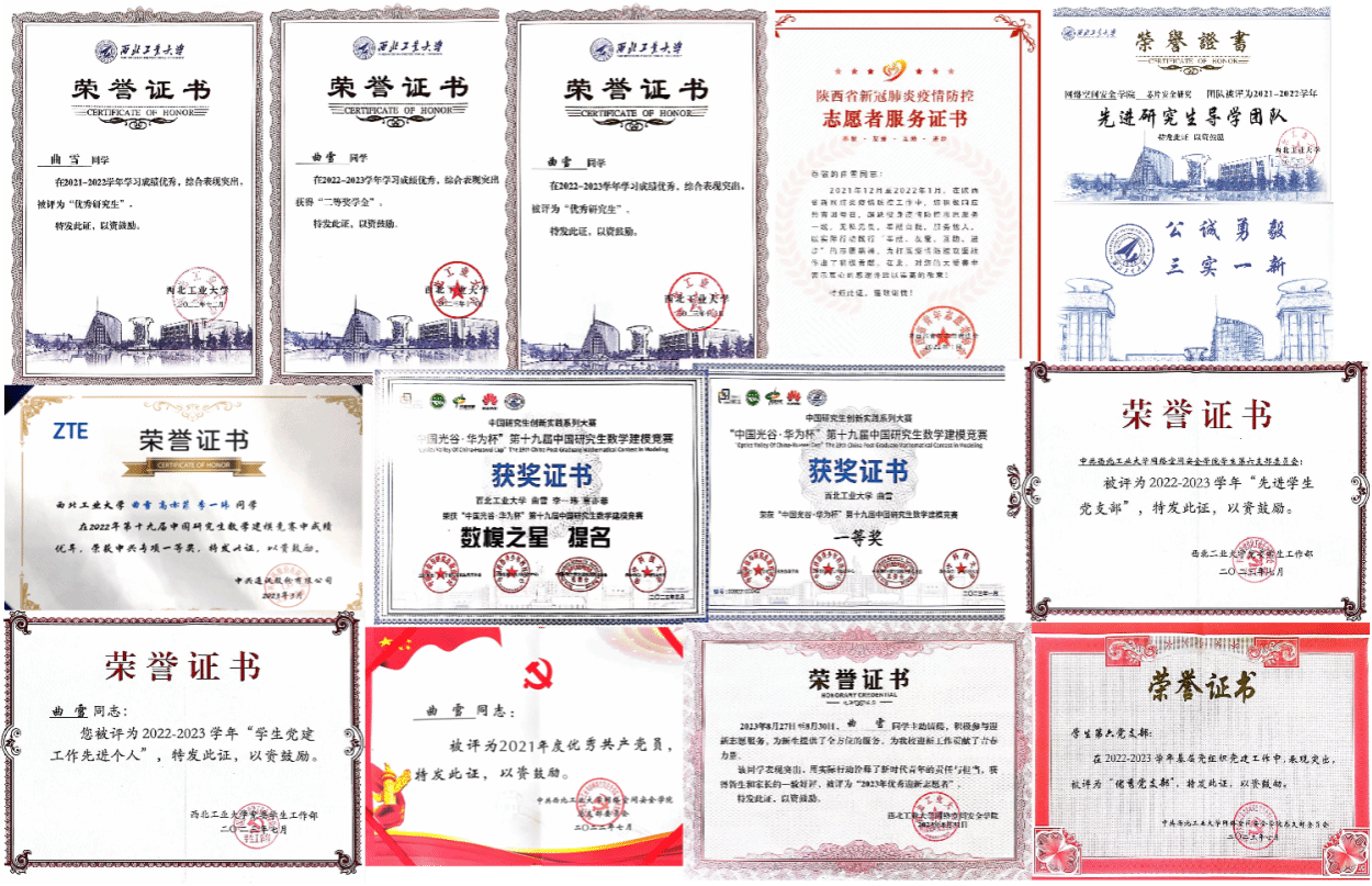 她正视困难、求实奋进,成绩始终位于专业前10%,连续两年获评西北工业大学“优秀研究生”,获校级奖学金。面向国家安全重大战略需求,在导师和团队老师引领、同门配合下,曲雪积极参与科学研究,参加国家重点课题2项,发表论文2篇,专利1项,软著1项。同时,参与教材编写,担任本科生专业课程助教,并踊跃参加实习实践交流活动,不断更新知识、拓宽视野,提升自身能力。此外,曲雪多次参加学科竞赛并均取得优异成绩。在第十九届“华为杯”研究生数学建模竞赛中从近1万8千支队伍中脱颖而出,获国家一等奖(获奖比例为1.10%),中兴专项一等奖(仅两队),数模之星提名奖(获奖比例为0.067%)。