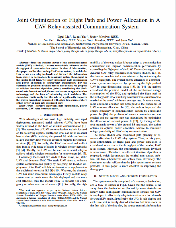 论文:《Joint Optimization of Flight Path and Power Allocation in A UAV Relay-assisted Communication System》,第一作者,发表于Wireless and Optical Communications Conference.
