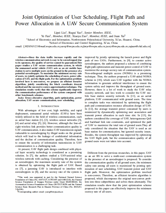 论文:《Joint Optimization of User Scheduling, Flight Path and Power Allocation in A UAV Secure Communication System》,第一作者,投稿于Communication Letters.