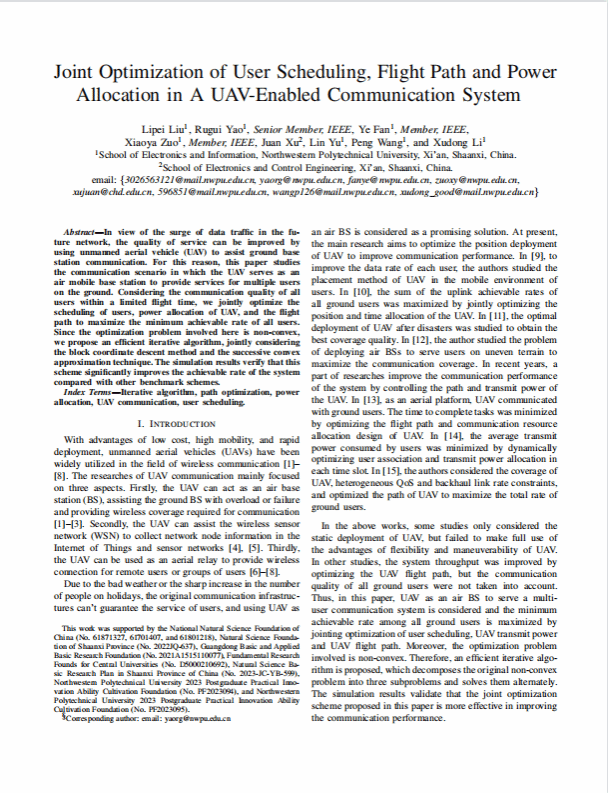 论文:《Joint Optimization of User Scheduling, Flight Path and Power Allocation in A UAV-Enabled Communication System》,第一作者,发表于International Conference on Signal Processing and Communication Systems.