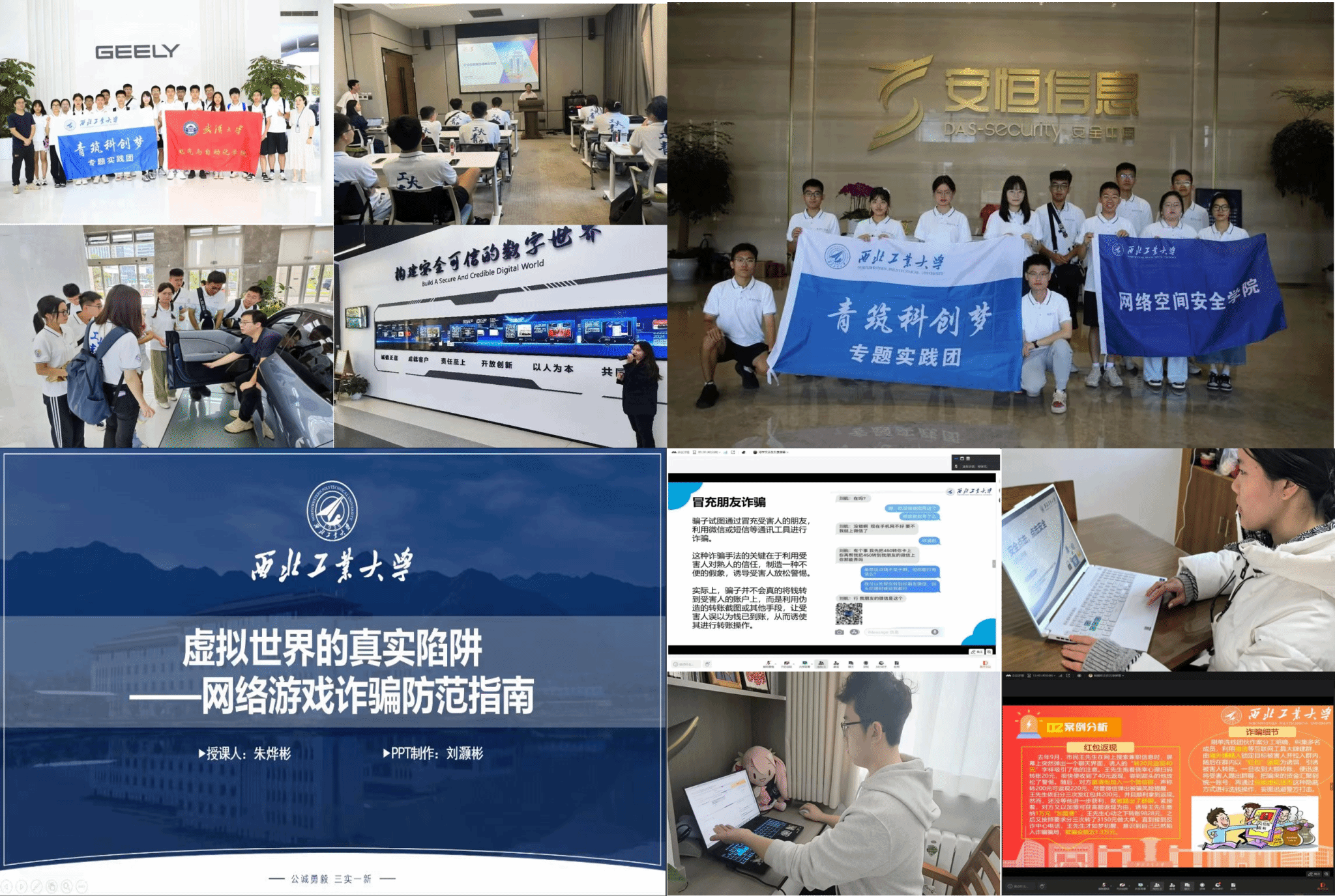 以实践活动为载体,推动产教融合与社会服务。通过组织"访龙头企业,探信创未来"暑期实践,引导学生走进信创企业,了解国家网络安全战略布局,增强专业使命感;同时成立网安反诈宣传队,面向中小学生、中老年及偏远地区群体开展精准宣讲,累计覆盖1500余人次,开发专题课程22项,有效提升公众网络安全意识。两项实践将专业知识与社会需求紧密结合,既深化了学生的专业认知与责任担当,也为服务网络强国战略注入青春动能。