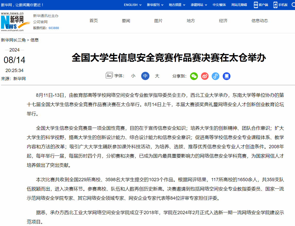 跨时空对话,吸取一流网安院校丰富经验,在学生中形成了良好的学科竞赛氛围,成效显著。学院应邀在2024世界互联网大会“互联网之光”博览会参展,展示学院特色学科方向和人才培养体系。近年来,学院学生在中国国际大学生创新创业大赛中共获得省级及以上奖项10余项,今年学院团队在国赛中获得铜奖,在挑战杯“揭榜挂帅”专项赛中获得国家级一等奖、二等奖各1项,实现学院在此类竞赛上的新突破。