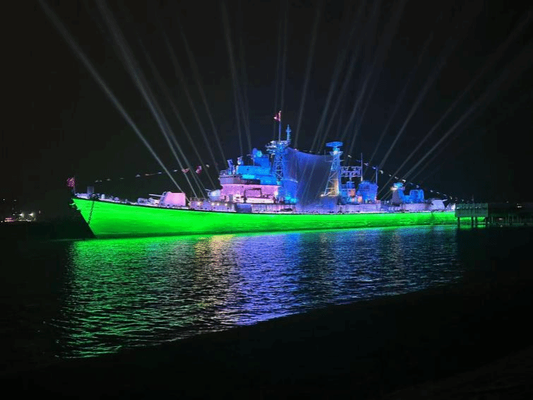2023级本科生李悦在湛江奥体中心观看了军舰灯光展,以此增强了对家乡和祖国军事力量的自豪感。