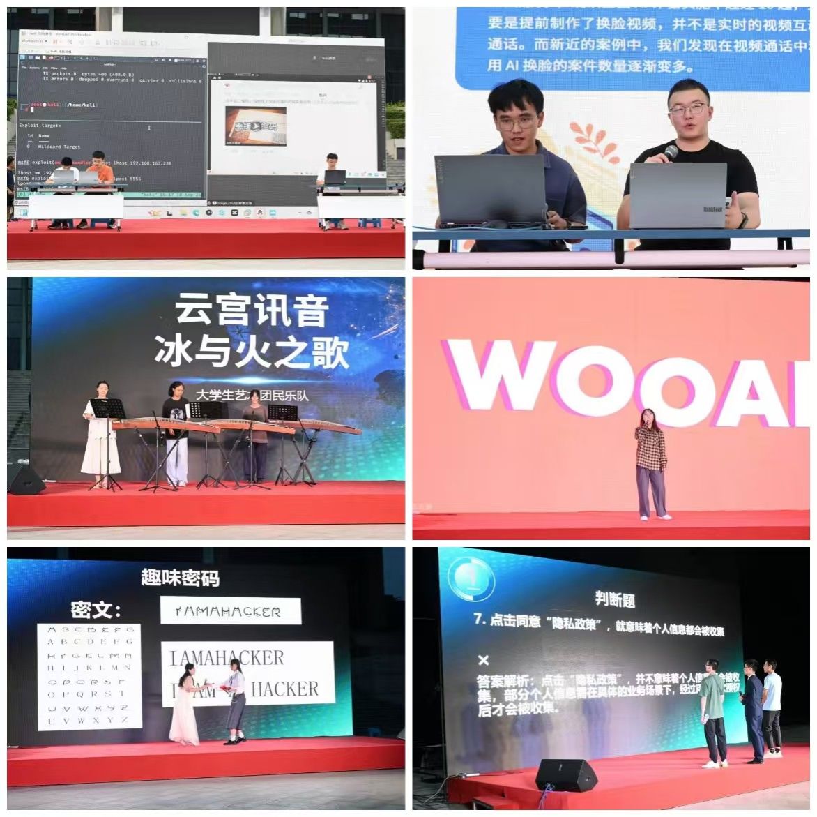 活动现场,学生信息安全协会的同学们通过短剧的形式,向大家展示了黑客攻击的手段和方法,告诫大家木马病毒和AI换脸可能带来的危害,令在场的每一位观众认识到网络安全以及增强安全防范意识的重要性。除了“黑客”小短剧,来自大学生艺术团民乐队和色播 的同学们为大家带来了精彩的才艺表演,充分活跃了现场的气氛。探索解密环节,同学们上台破解了一个个趣味密码,亲身体验了解密和挑战的乐趣。在知识竞答环节,同学们踊跃参与,争相回答,在欢快的气氛中学习到网络安全的相关知识。