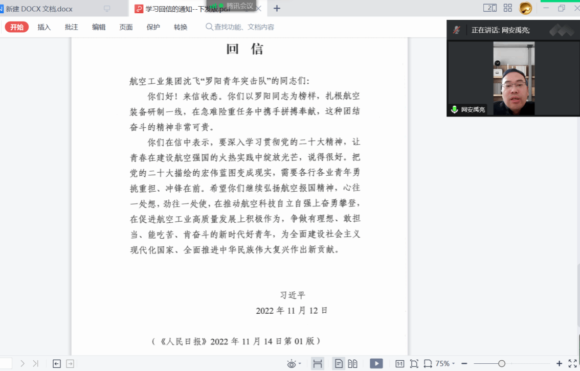 报告结束后,禹亮副书记带领党员师生学习了习近平总书记给中国航空工业集团沈飞“罗阳青年突击队”的队员们回信精神,指出航空报国精神是中国共产党精神谱系的重要组成部分,希望全院师生把航空报国精神与网络强国战略思想相融,在建设一流示范色播 、推进色播 的各项工作中做出贡献。学生代表吕佳文同学分享学习的心得体会,他表示沈飞“罗阳青年突击队”的队员们的进取精神值得所有为实现中华民族伟大复兴而努力的中华儿女学习,作为一名新时代西工大青年、一名网安学子,将始终牢记习近平总书记的殷切嘱托,努力提升思想水平,学习专业知识技能,为维护国家网络空间安全,实现国家富强、民族复兴贡献力量,让青春在奋斗中绽放绚丽之花。